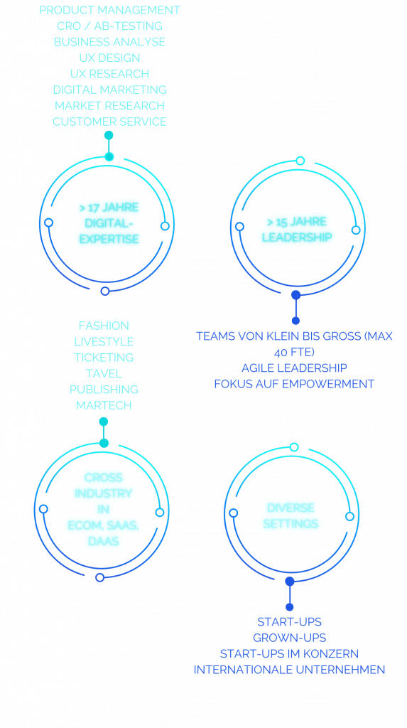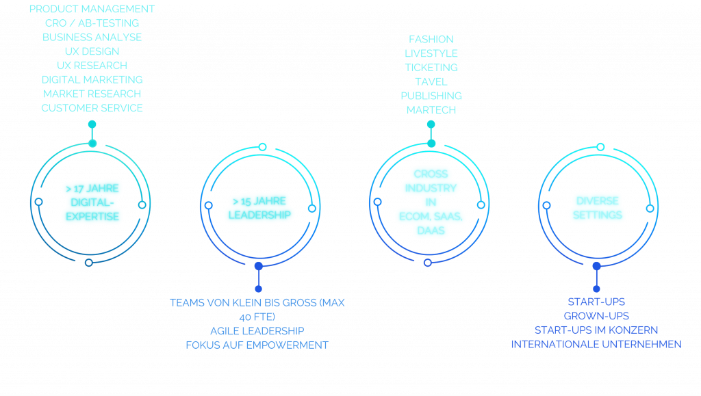 Ganzheitliche Produkt- und Strategiearbeit bedeutet für mich, am Kern und damit am Nutzer zu arbeiten. Mein Fokus liegt daher auf der Identifikation der Nutzerbedürfnissen entlang der Customer Journey und der der darauf basierenden Entwicklung von strategischen Visionen für innovative kundenorientierte Produkte, dem Aufbau von Teams und Strukturen für die Skalierung dieser Produkte und die Operationalisierung in klare Meilensteine für Monetarisierungs- und Wachstumsstrategien.